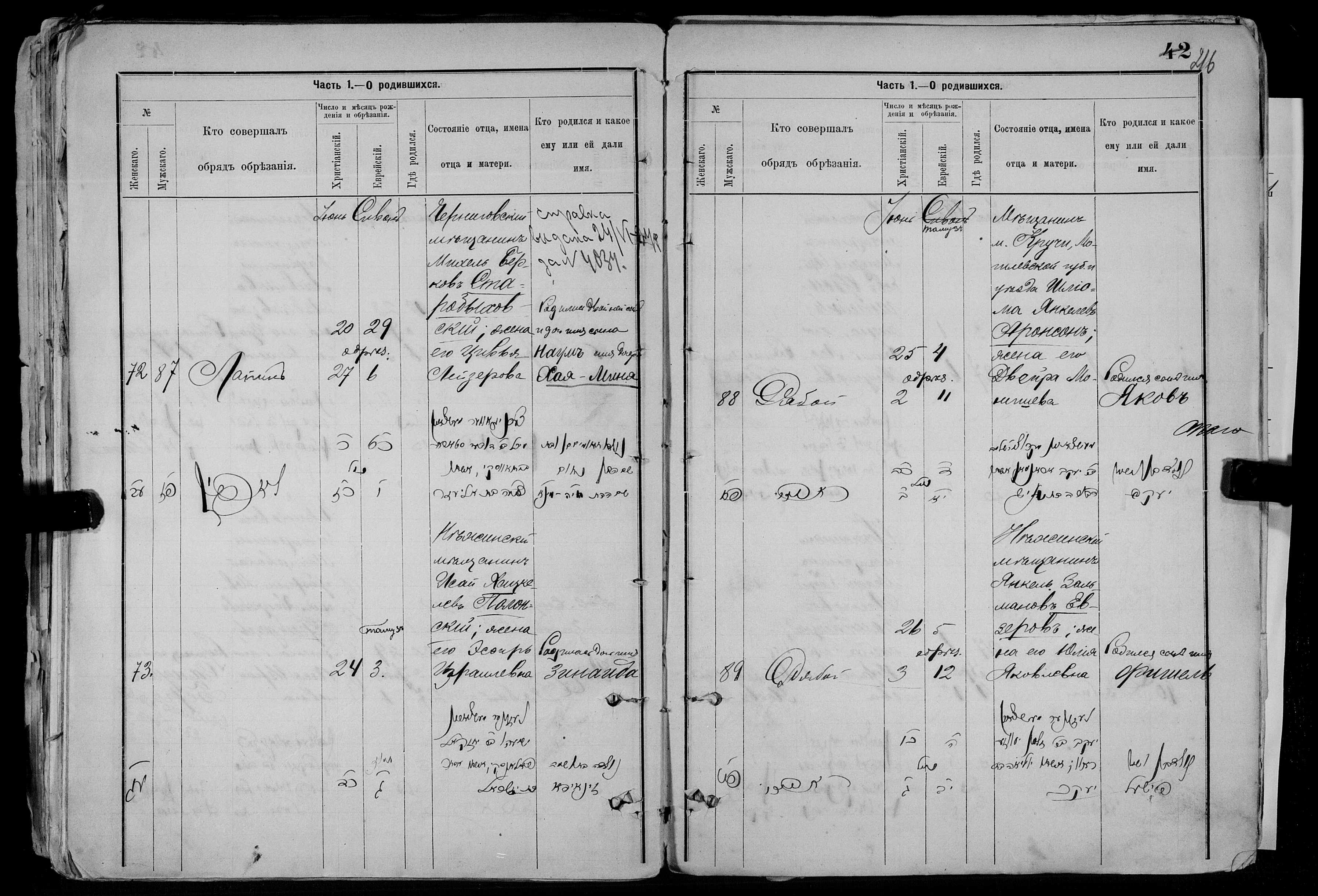 - Запись о рождении Якова Аронсона в канцелярии нежинского городового раввина 25 июня 1902 года: родители — мещанин местечка Кручи Могилёвской губернии и уезда Шлёма Янкелевич Аронсон, жена Двейра Монишевна.