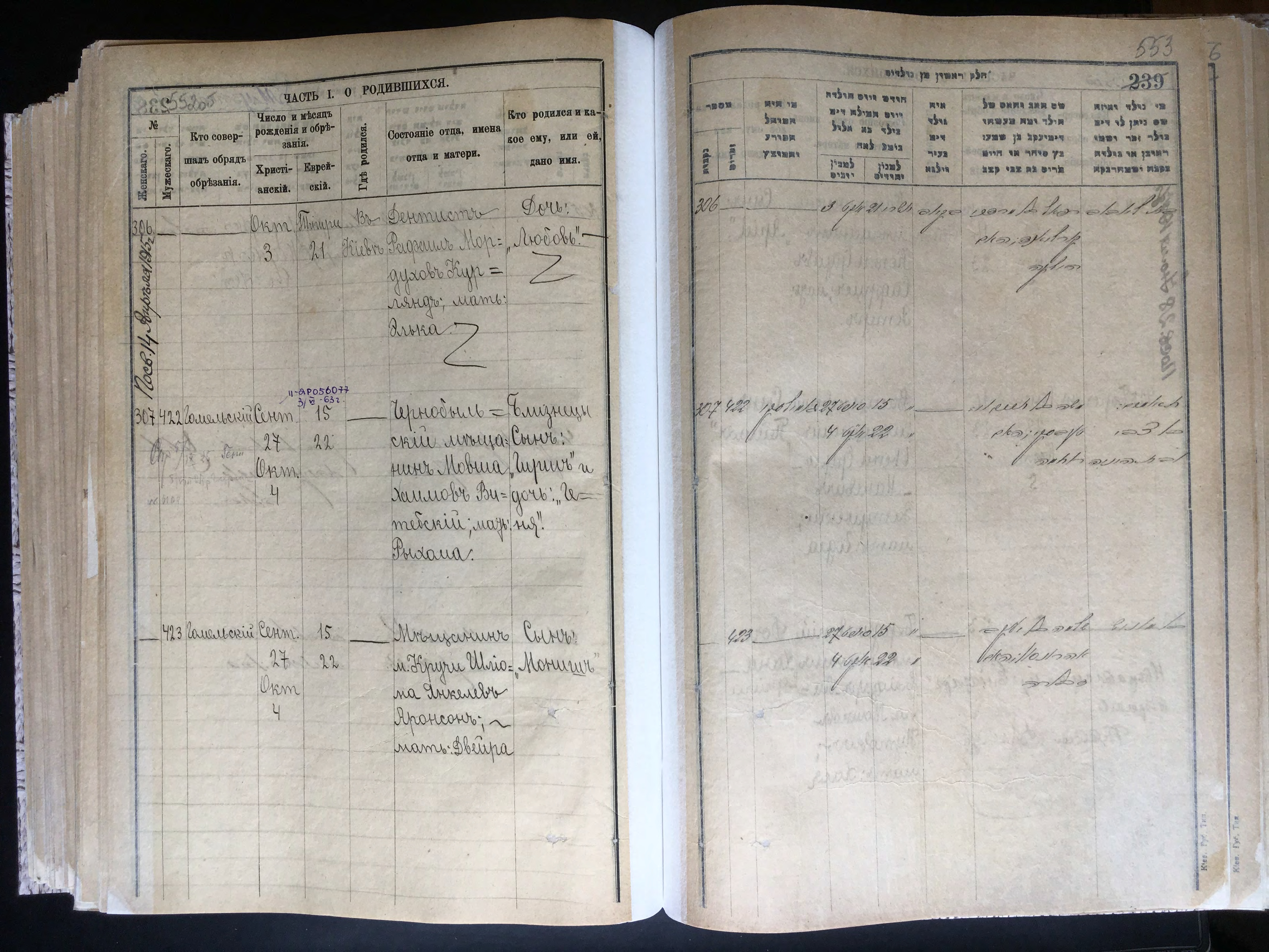 - Запись о рождении Мониша Аронсона в канцелярии киевского городового раввина 27 сентября 1908 года