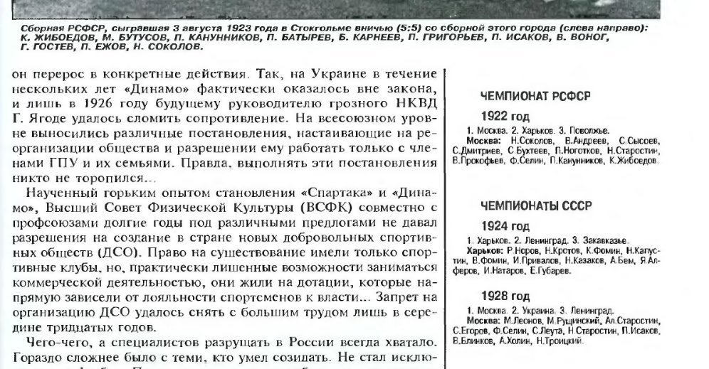 «Первый большой футбольный турнир состоялся в 1923 году в рамках I Всесоюзного Праздника физкультуры в Москве, а в следующем, 1924 году состоялось и Всесоюзное первенство, можно сказать, прообраз будущего чемпионата СССР. Участвовали в нем сборные городов и сборные союзных республик, а проводила турнир новая, только что созданная спортивная организация — Всесоюзная секция футбола, позже ставшая Федерацией футбола СССР. Схема соревнований была кубковая, а победителем стала сборная Харькова, одолевшая в финале сборную Ленинграда. В последующие годы состоялось еще несколько аналогичных турниров, но проводились они нерегулярно, а их регламент часто менялся.»