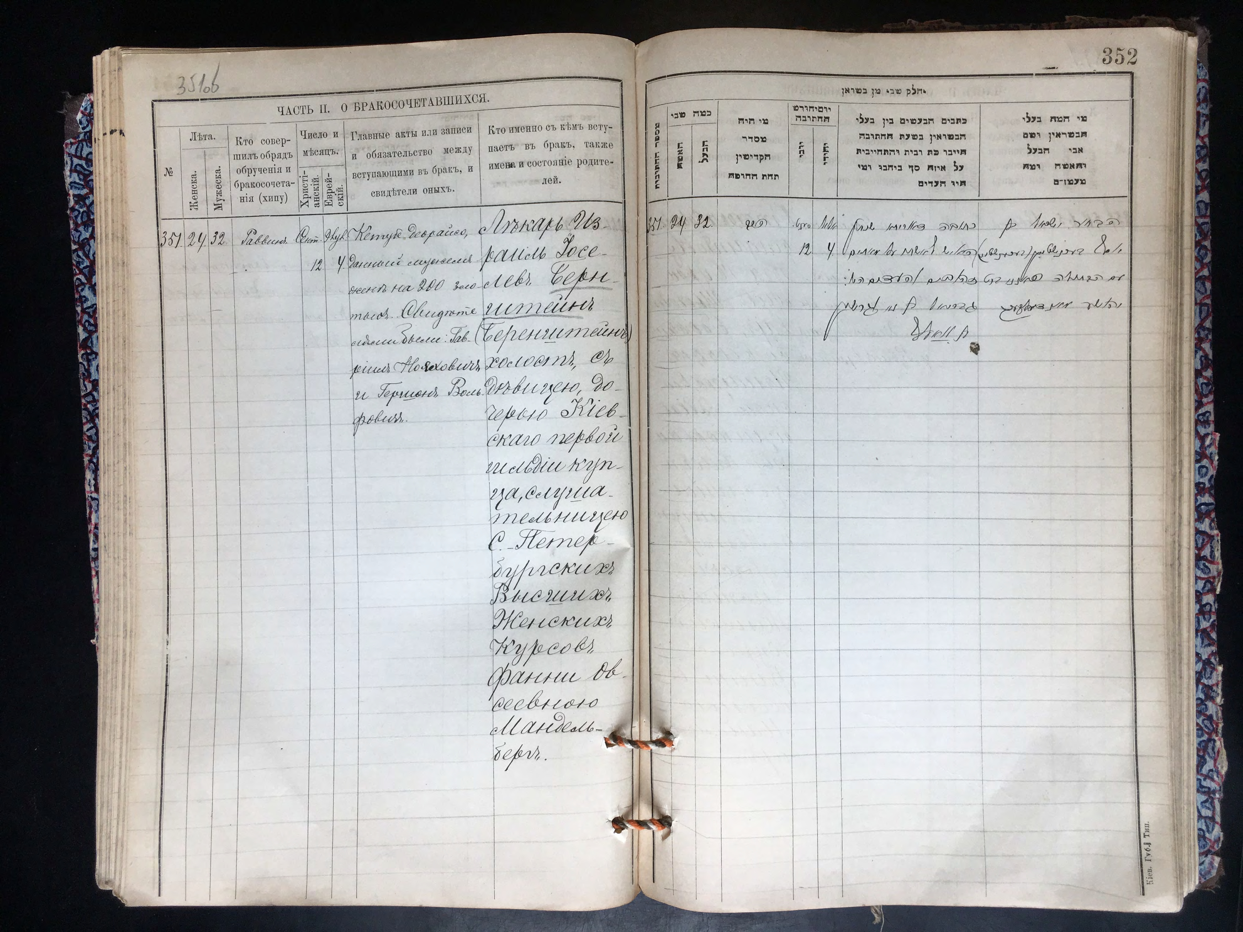 - Запись о бракосочетании сестры Фанни Овсеевны Мандельберг, слушательницы С-Петербургских высших женских курсов, и лекаря Израиля Йоселевича Бернштейна в канцелярии киевского городового раввина 12 сентября 1903 года