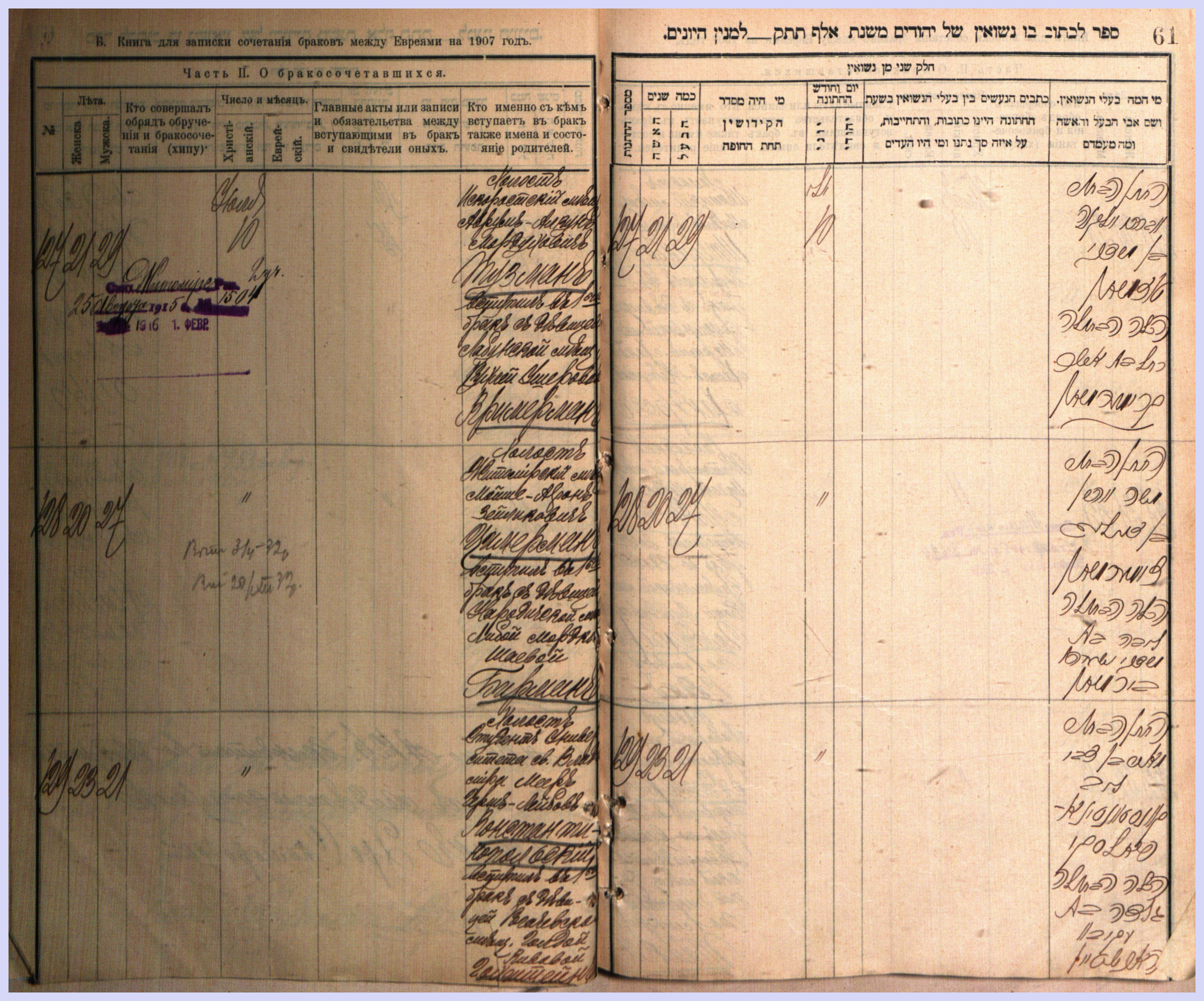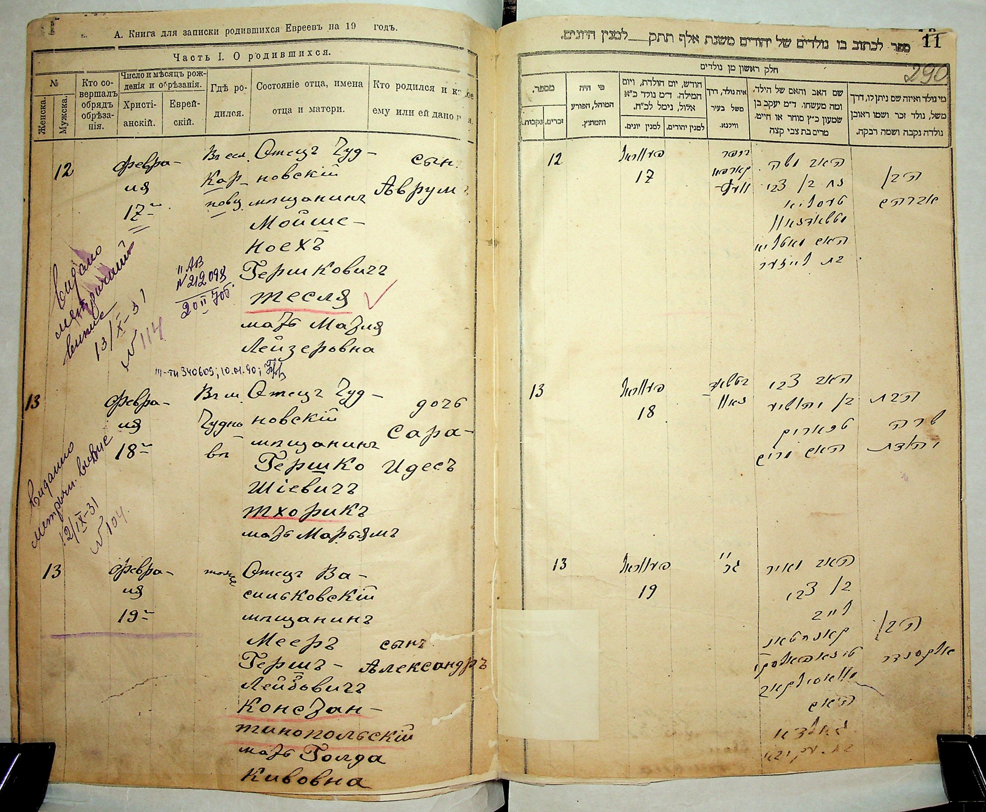 - Запись о бракосочетании родителей в канцелярии житомирского городового раввина: холост, студент Университета Святого Владимира Меер Герш-Лейбович Константинопольский, 21 года, вступил в первый брак с девицей, васильковской мещанкой Голдой Кивовной Гохштейн, 23-х лет.