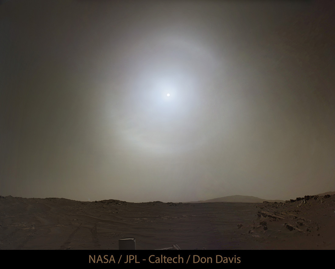 Дефекты линз, дополнительно замутняющие изображение по краям, были устранены в этой склейке 4 кадров Navcam-L с цветообработкой, где можно видеть разницу между диаметром собственно солнечного диска и областью свечения в тропосфере. До настоящего времени гало никогда на других планетах не наблюдалось. Чтобы подтвердить, что 15 декабря над Езеро действительно имел место «первый случай в истории», учёным необходимо предварительно исчислить ожидаемые параметры гало для Марса с учётом иного диаметра красной планеты и параметров её атмосферы. — Cherurbino (обс.) 05:12, 20 декабря 2021 (UTC)[ответить]