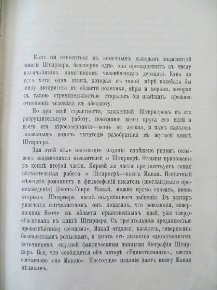 - Про аптекарское происхождение матери Штирнера говорится в предисловии к харьковскому изданию «Единственного» 1994 г. С этим предисловием отдельная история: оно оставлено без подписи, и несмотря на то, что в выходных сведениях указано, что книга печатается по изданию «Светоча» 1907 г. под ред. С.А. Венгерова, скорее всего оно не оттуда. В пользу этого свидетельствует во-первых то, что в издании 1907 г. был опубликован Маккей, что делало бы биографическую справку излишней, а во-вторых, найденное в сети фото первой страницы предисловия, где говорится, что биографию расскажет Маккей. Остаётся два варианта: либо предисловие дёрнуто из какого-то другого издания, либо написано кем-то из «фирмы Торсинг», которая, как указано в книге, писала комментарии к изданию. Про предисловие, однако, не сказано ровным счётом ничего.