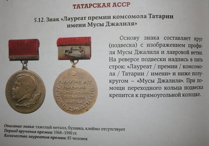 Я думаю, что это может быть отрывок из каталога-справочника «Знаки лауреатов премии Ленинского комсомола: ЦК ВЛКСМ, республик, краев и областей РСФСР (1966—1991)» (2012, автор — Дмитрий Александрович Решмет; также, согласно каталогу РГБ, в 2014 году издавался аналогичный справочник под наименованием «Знаки лауреатов премии Ленинского комсомола республик СССР (1966—1991)», автор тот же). Оформление такое же, как на фото, присланном коллегой Engelberthumperdink (1, 2, 3). — Полиционер (обс.) 19:23, 31 августа 2021 (UTC)