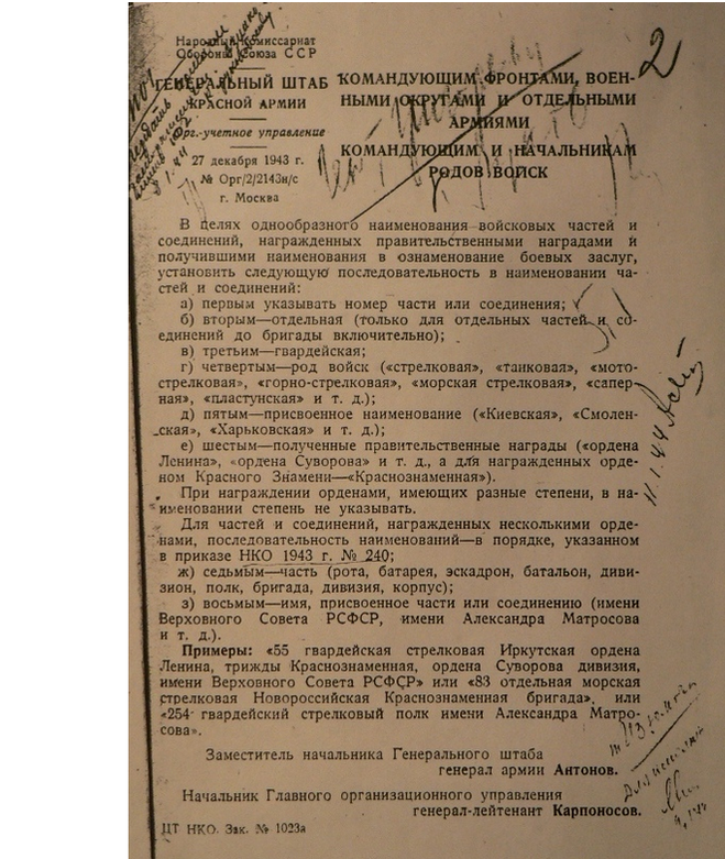 - Директива Генерального штаба Красной Армии 27 декабря 1943 года № Орг/2/2143н/с В целях однообразного наименования войсковых частей и соединений установить следующую последовательность в наименовании частей и соединений.