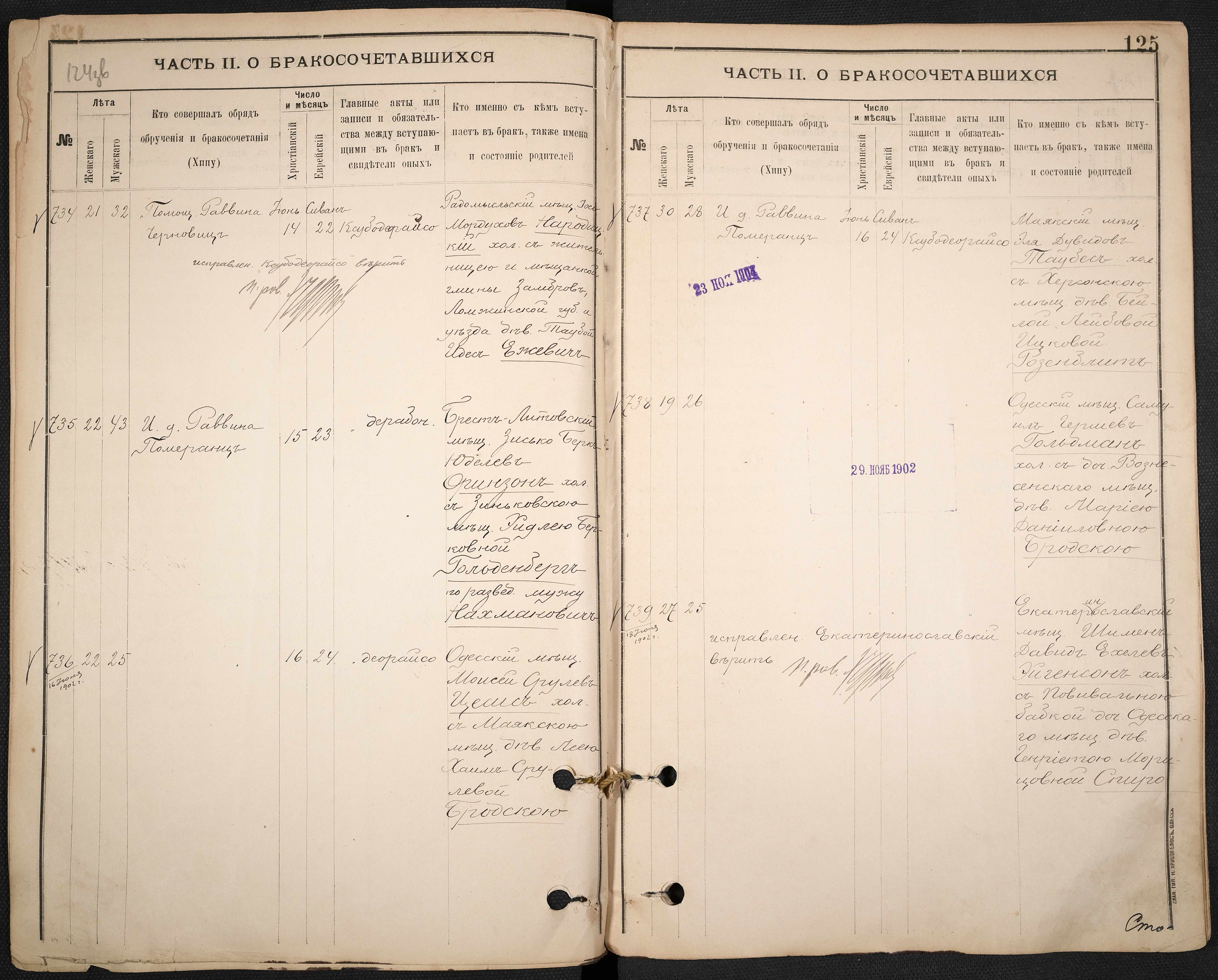 - Запись о бракосочетании родителей в канцелярии одесского городового раввина 16 июня 1902 года